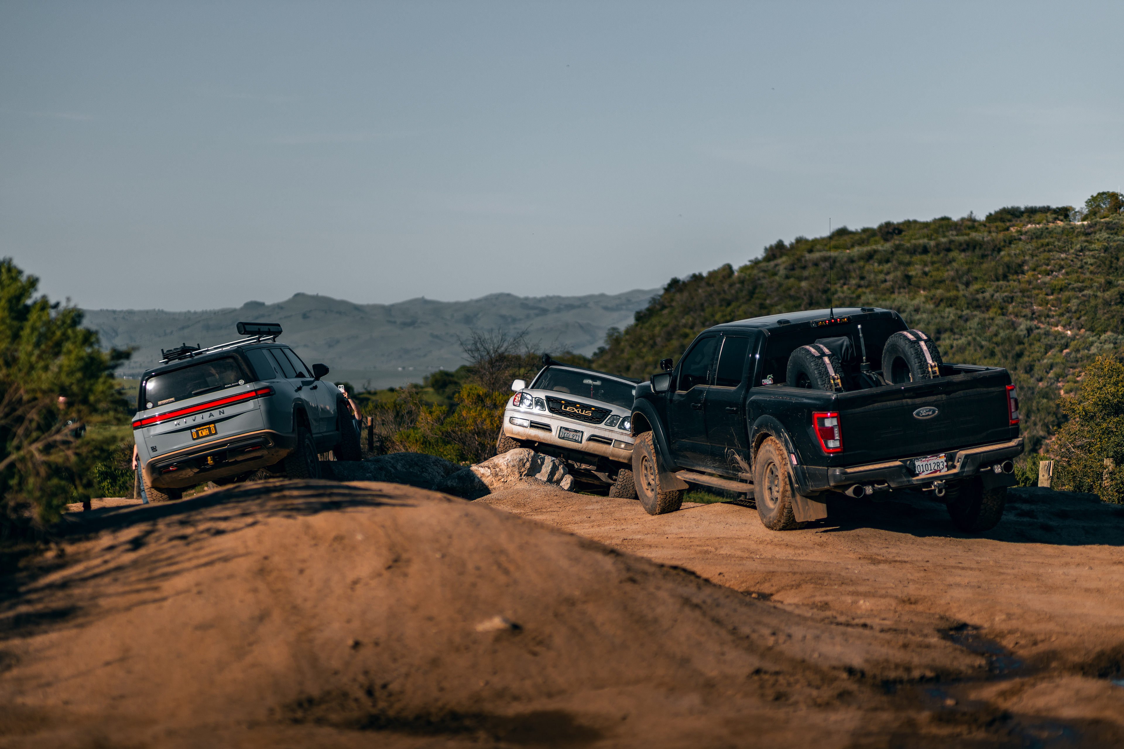 The park delivered everything you expect—tight hill climbs, off-camber trails, and deep mud puddles that made for plenty of photo ops (and clean-up later). The Rivian handled the terrain like a champ, showcasing that electric torque on the steep climbs, while my Raptor brought some serious attitude to the trail.
